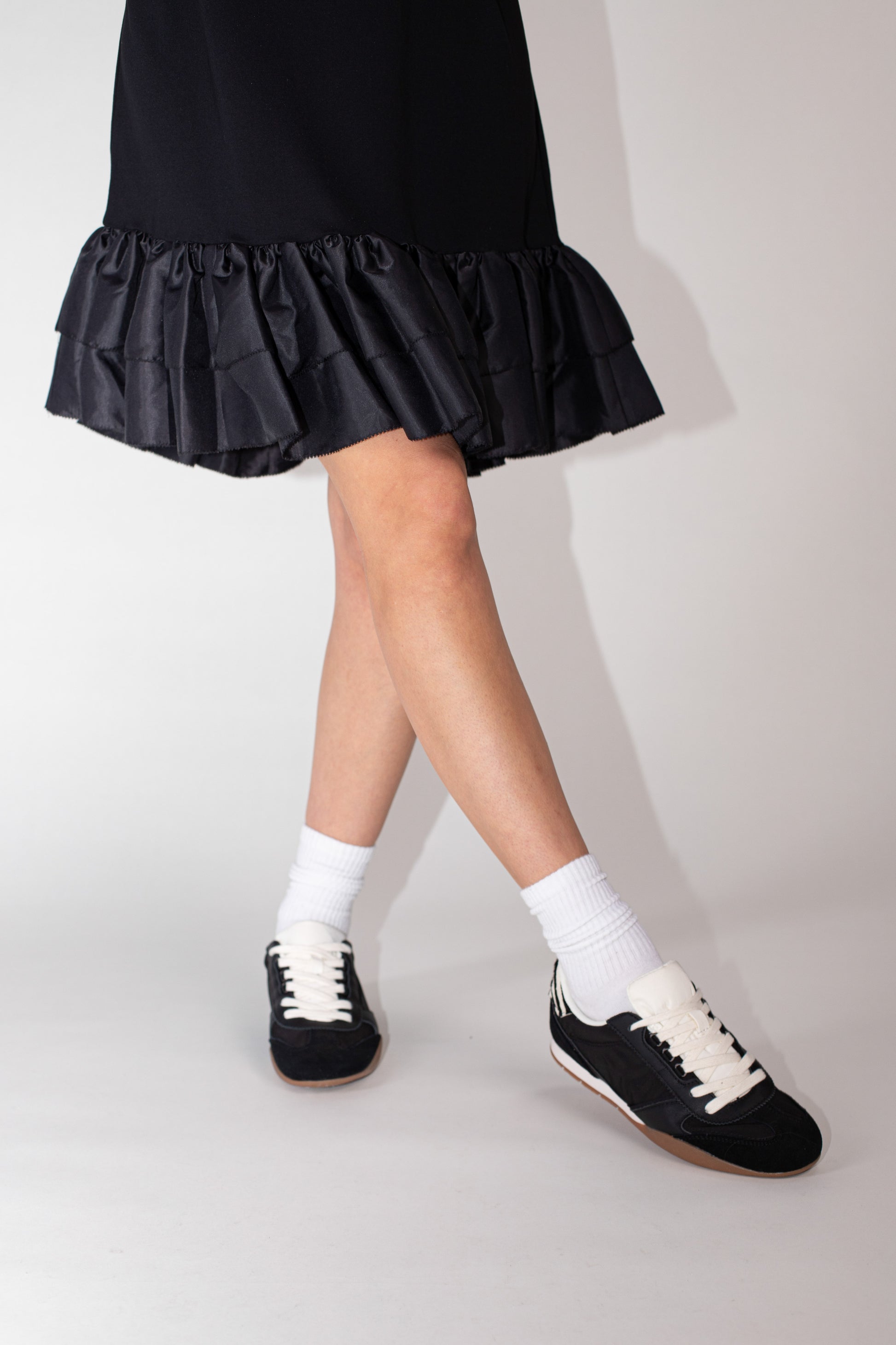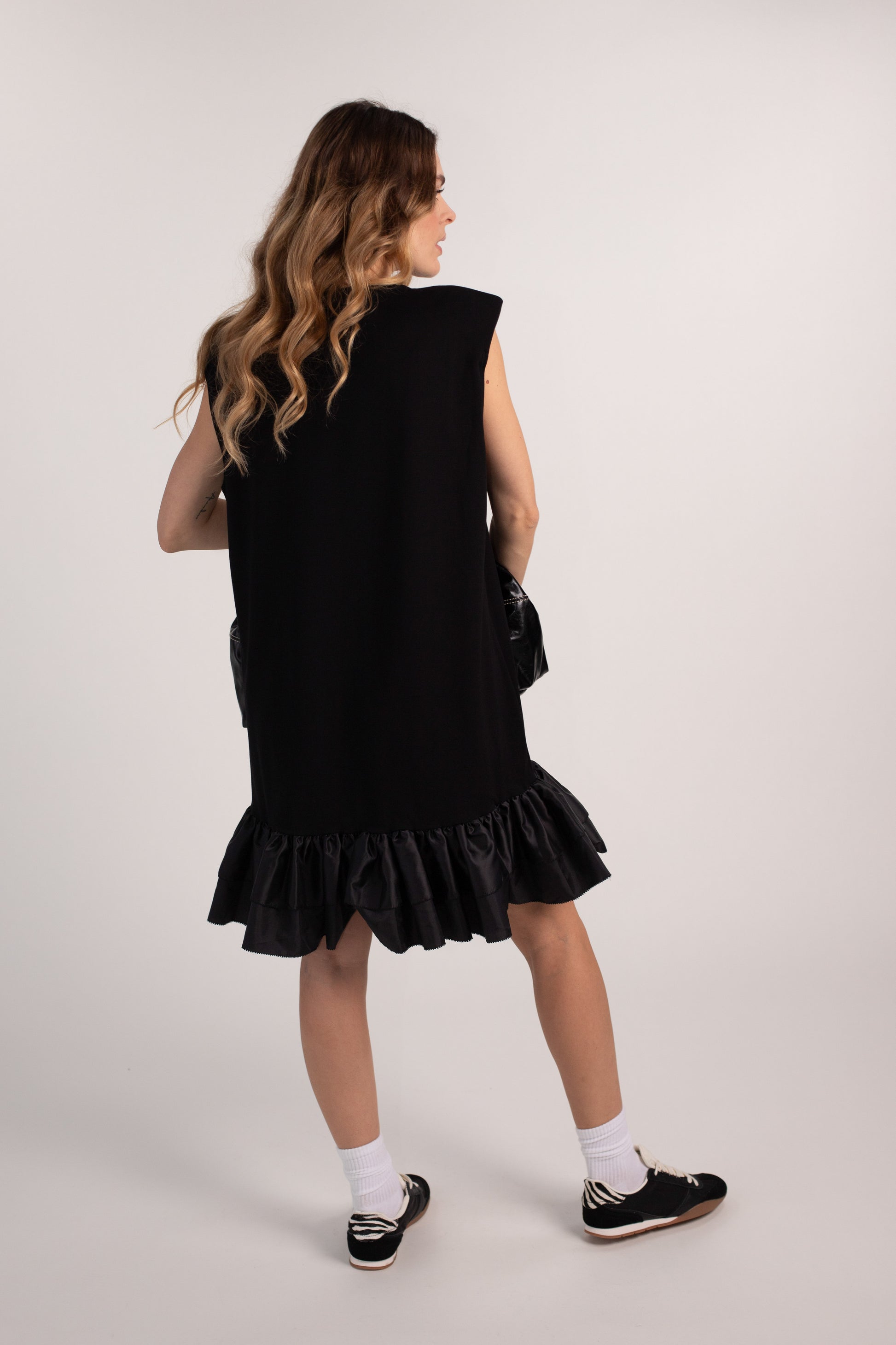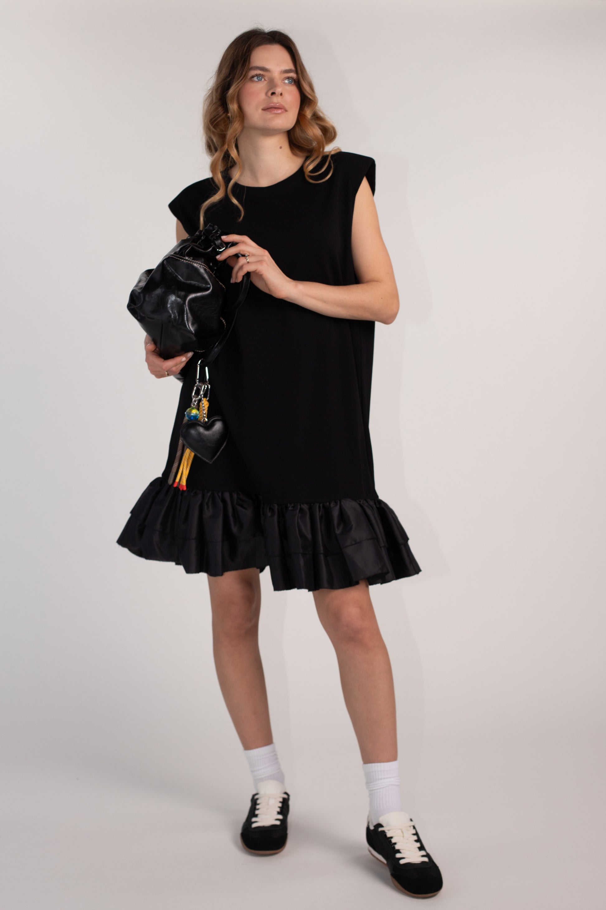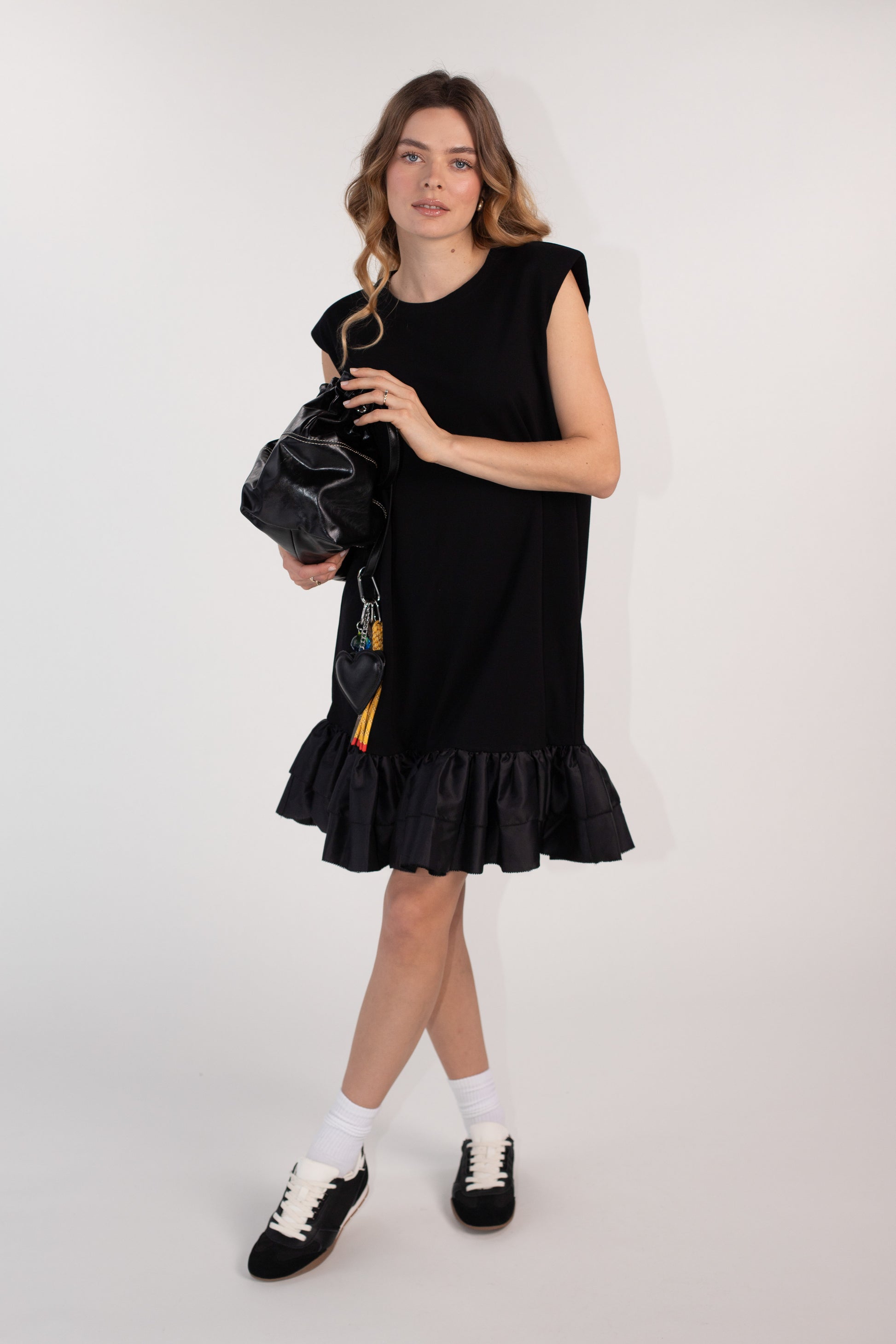 Dodaj lekkości swojej garderobie dzięki tej eleganckiej czarnej sukience o luźnym kroju. Sukienka wykonana jest z lekkiego materiału, co sprawia, że jest niezwykle komfortowa w noszeniu. Krótkie rękawy i okrągły dekolt nadają jej klasycznego charakteru, a dół zdobiony falbaną dodaje sukience dziewczęcego uroku. Idealna na codzienne wyjścia, zapewnia zarówno styl, jak i wygodę.
