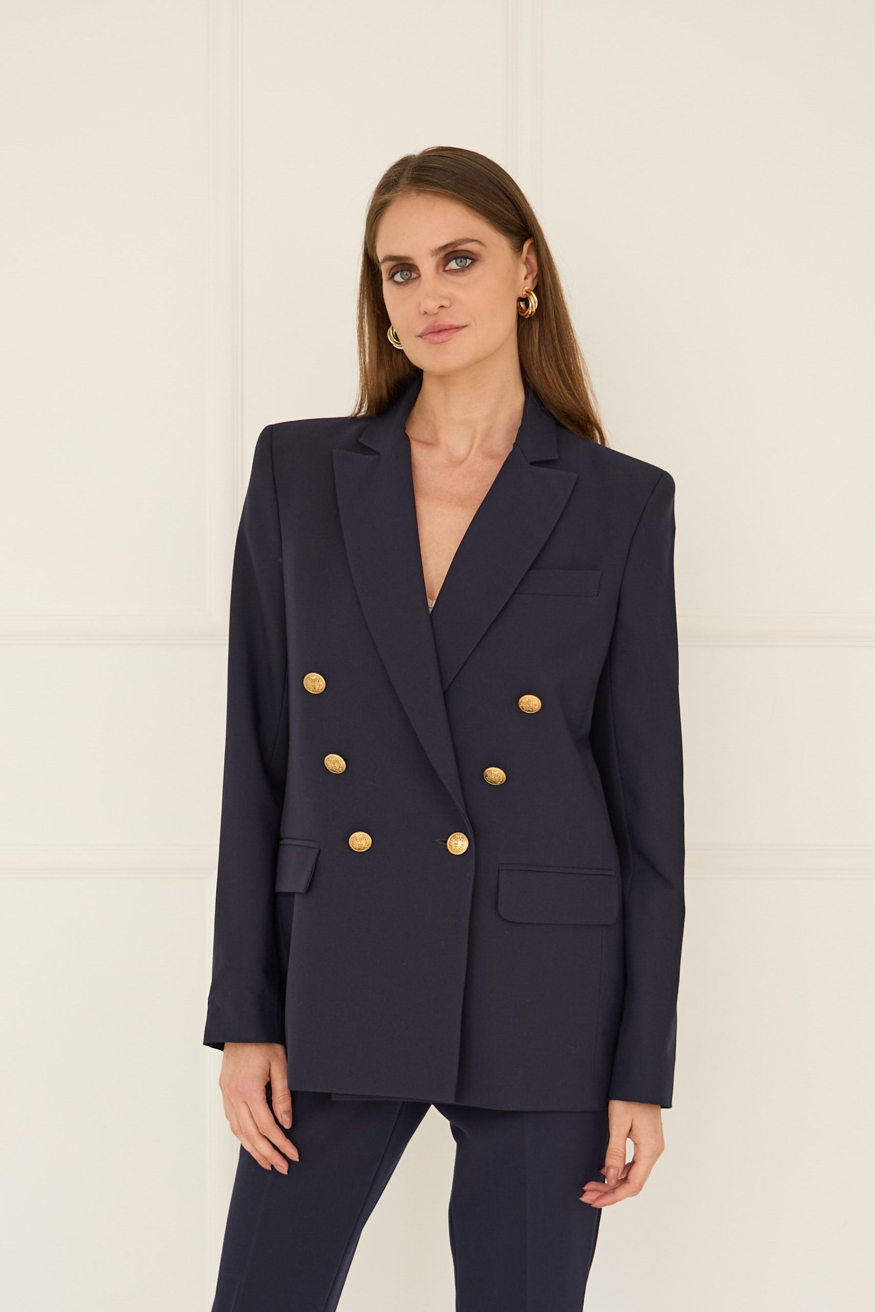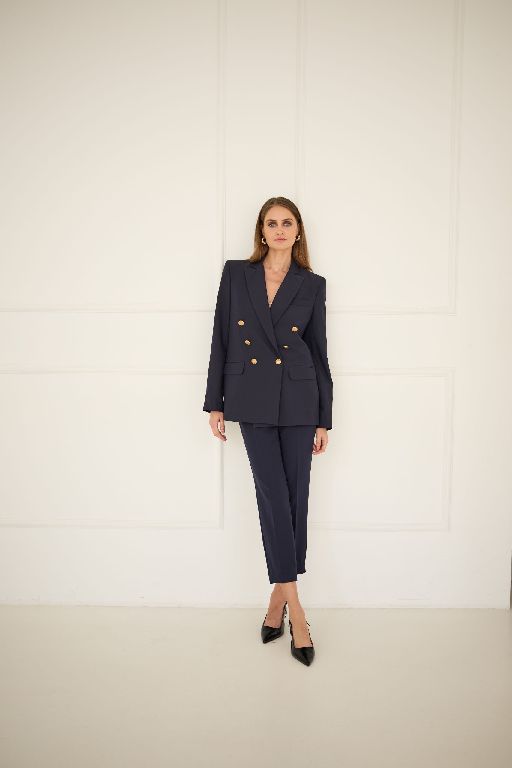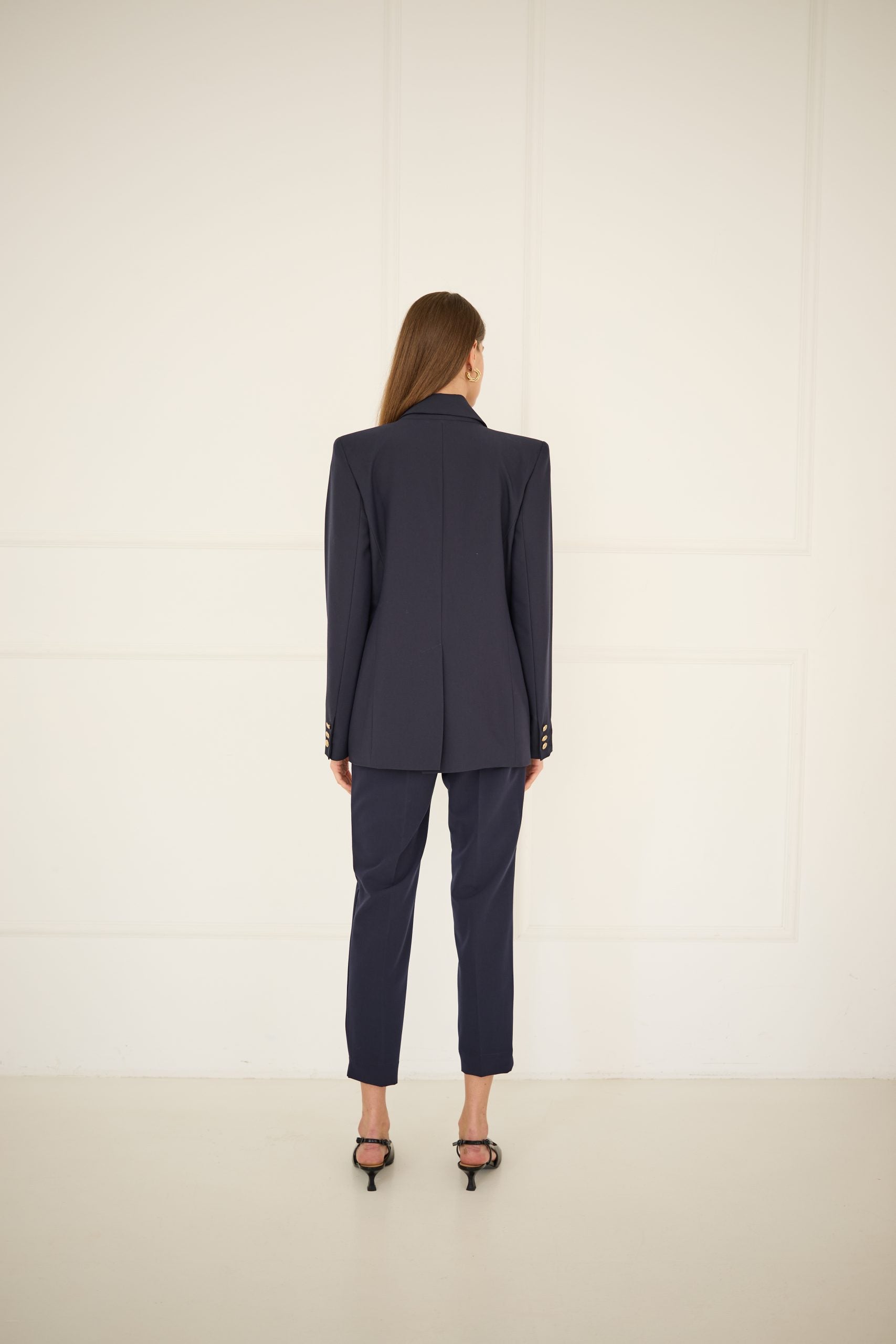 Marynarka dwurzędowa granatowa to stylowa marynarka o luźnym fasonie typu oversize z mocniej zarysowanymi ramionami. Marynarka jest w odcieniu ciemnego granatu, guziki metalowe w kolorze starego złota, podszewka z logo marki. Marynarka najlepiej prezentuje się do jeansów w kolorze jasnym lub niebieskim, a także razem w komplecie z granatowymi cygaretkami.