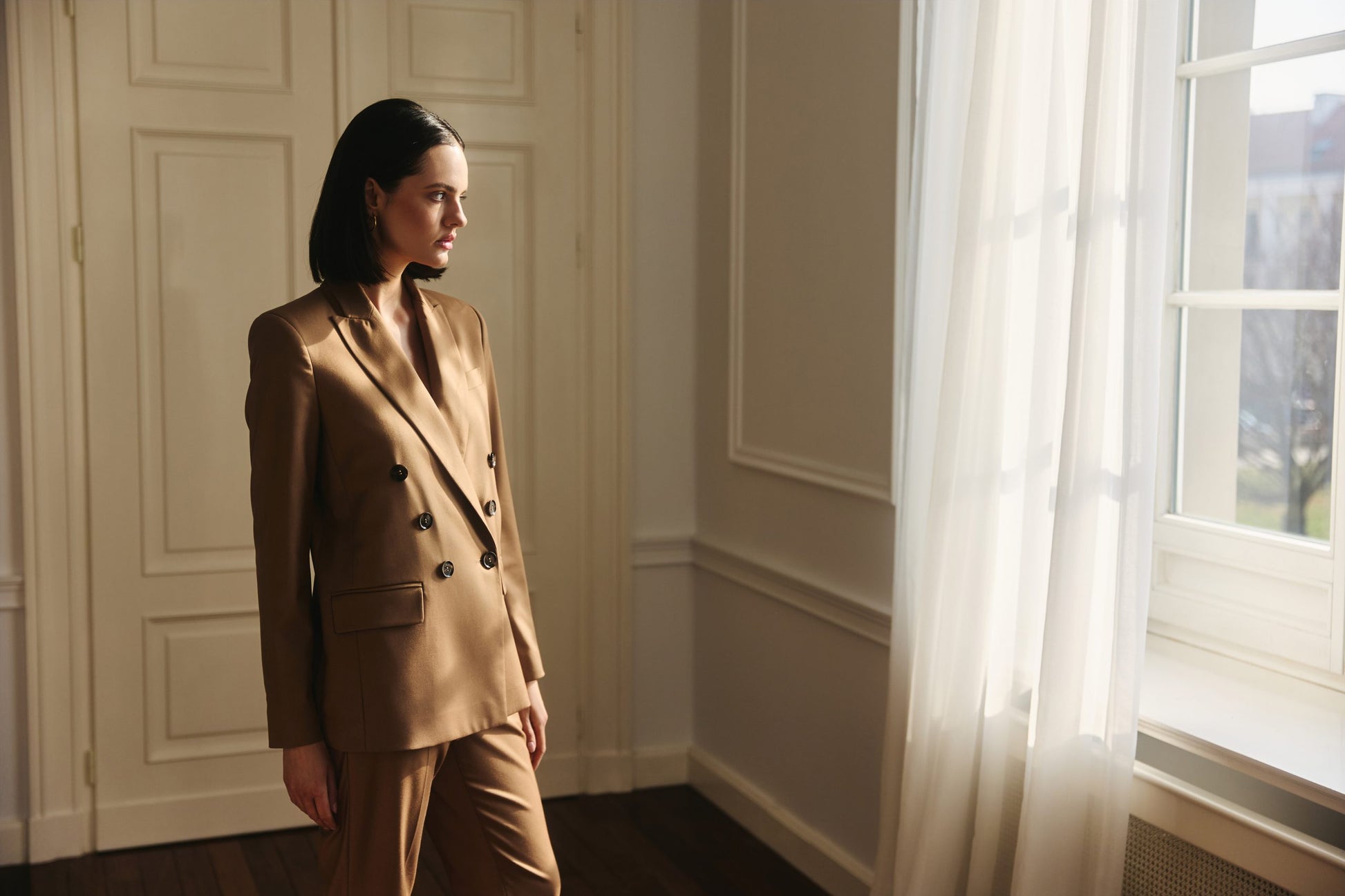 Marynarka dwurzędowa karmelowa to stylowa marynarka o luźnym fasonie typu oversize z mocniej zarysowanymi ramionami. Marynarka jest w odcieniu karmelu, guziki w kolorze ciemnej czekolady z nutami beżu, podszewka z logo marki. Marynarka najlepiej prezentuje się razem z cygaretkami do kompletu lub może być noszona do jeansów.