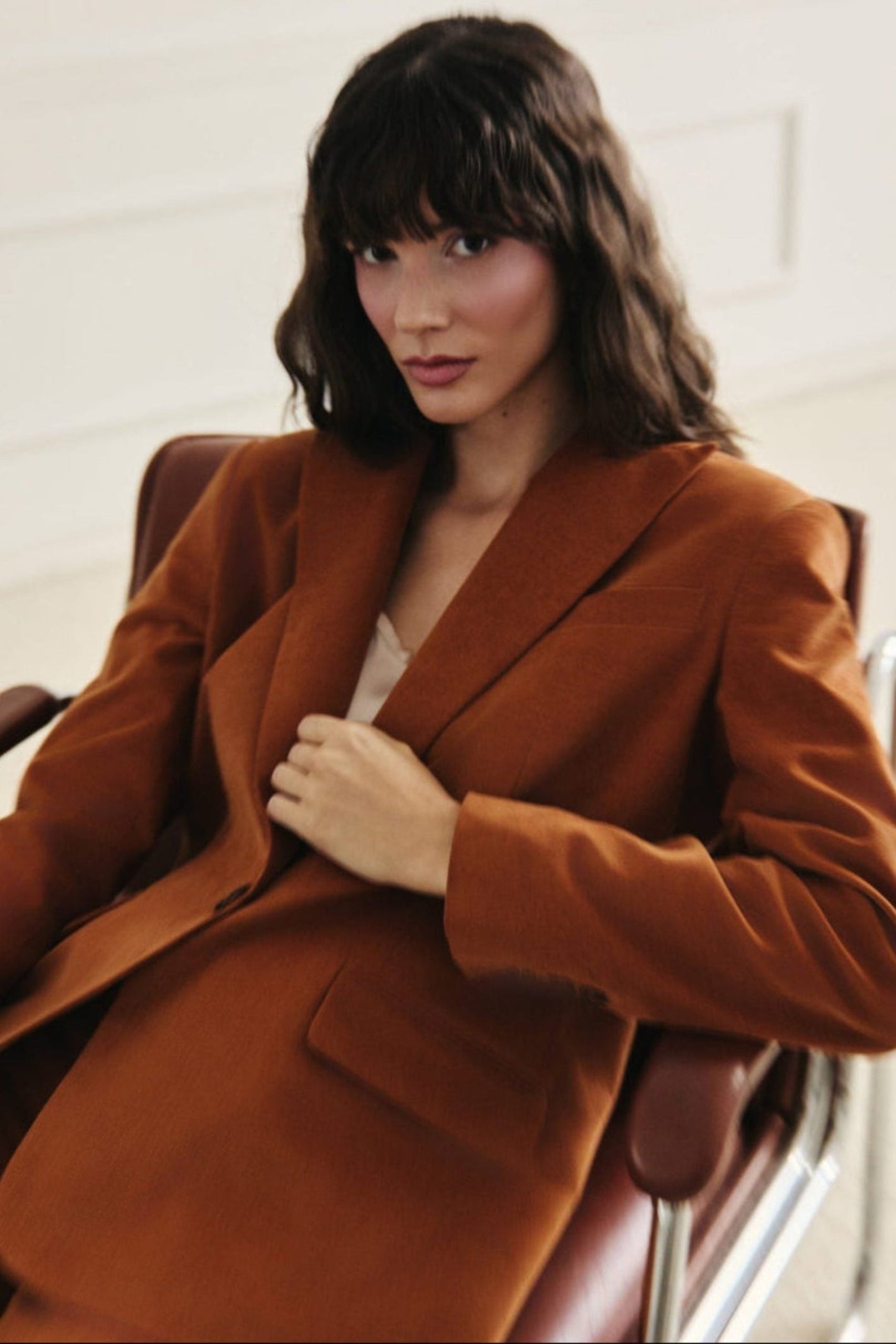 Marynarka sztruksowa koniakowa to pudełkowa marynarka o klasycznym i lekko oversizowym kroju z poszerzoną linią ramion.