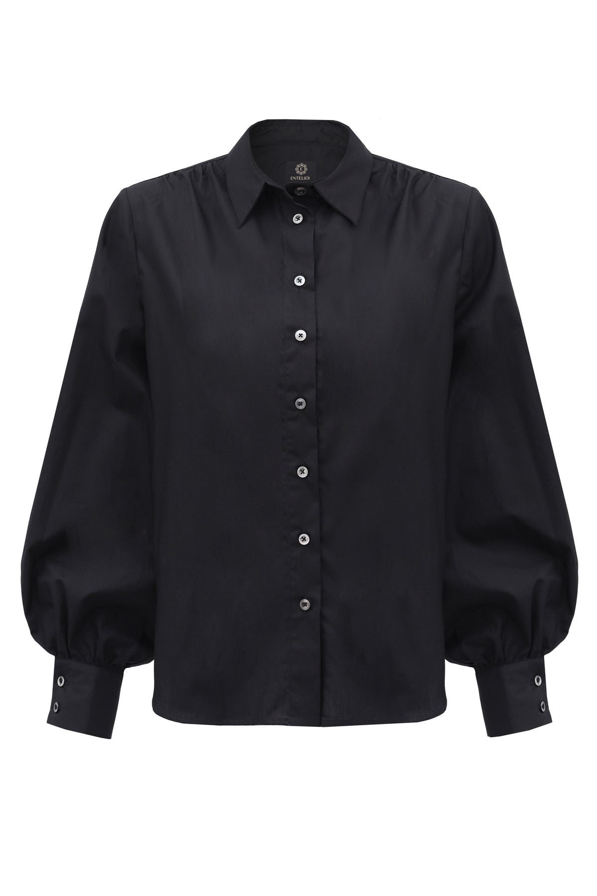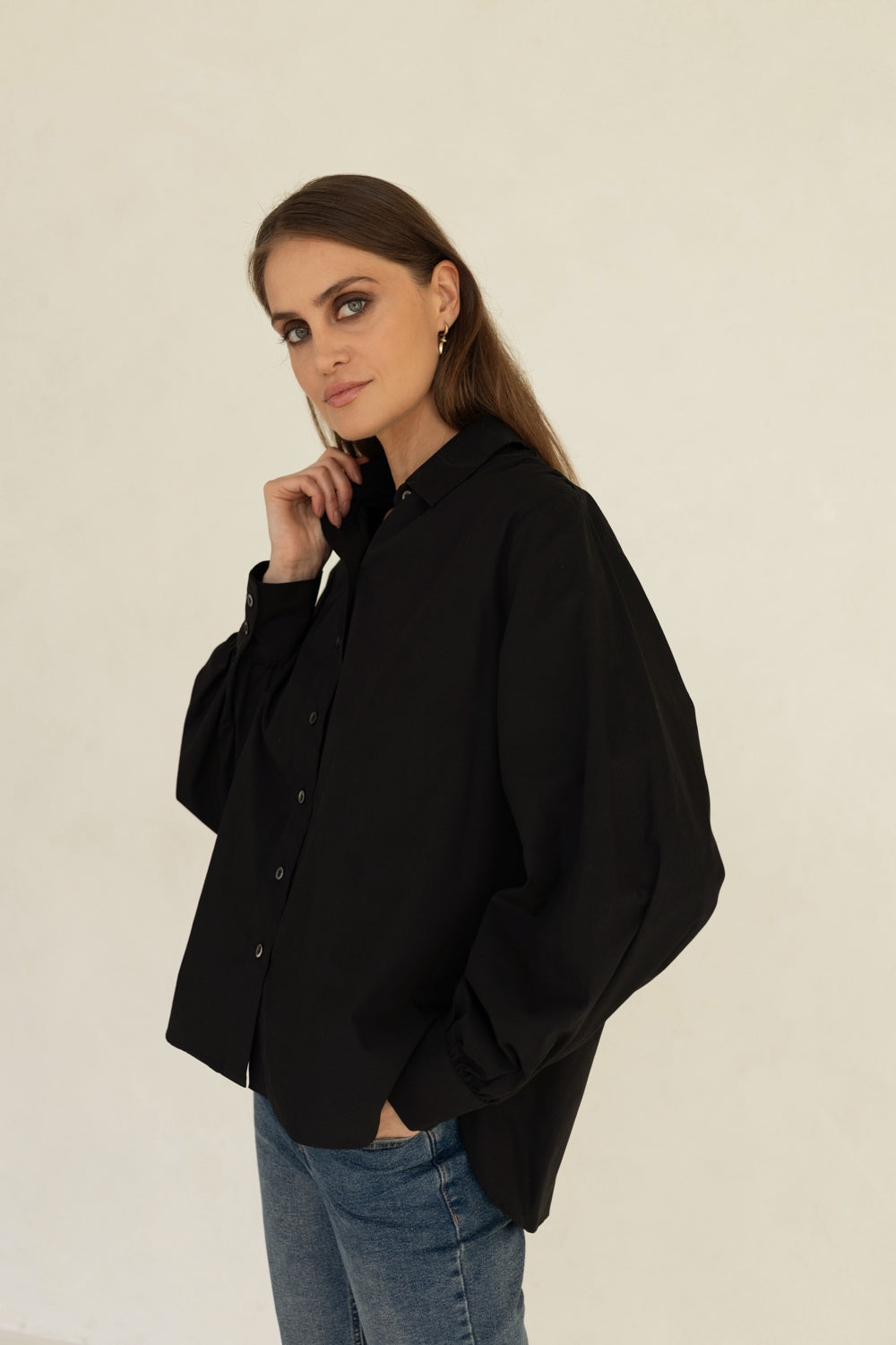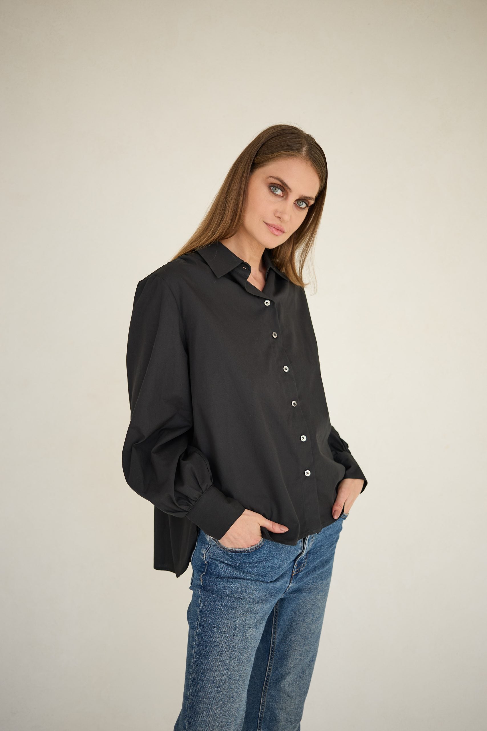 Koszula Noel bawełniana czarna to koszula typu oversize. Koszula ma klasycznie wszywane rękawy na ramionach i lekko marszczone. Dół rękawów bufiasty zakończony eleganckim mankietem na dwa guziki, dół koszuli zaokrąglony. Wykonana jest z tkaniny przewiewnej bawełnianej, guziki z masy perłowej w kolorze tkaniny. Koszula idealna do klasycznych spodni lub dżinsów. Koszula występuje w jednym rozmiarze pasującym na sylwetki 36-42. Modelka ma 179 cm wzrostu.