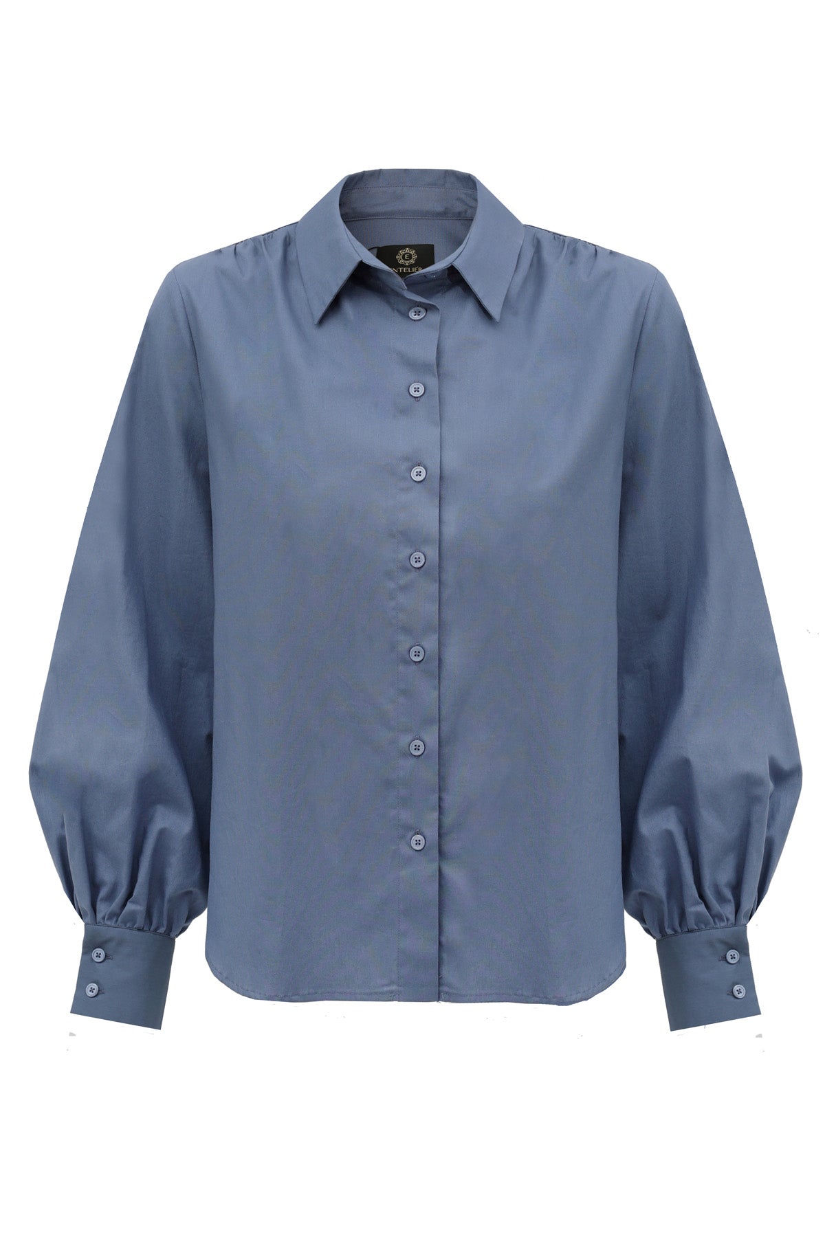 Koszula Noel niebieska to koszula typu oversize. Koszula ma klasycznie wszywane rękawy na ramionach i lekko marszczone. Dół rękawów bufiasty zakończony eleganckim mankietem na dwa guziki, dół koszuli zaokrąglony. Wykonana jest z tkaniny przewiewnej bawełnianej w przepięknym niebieskim odcieniu denim, guziki z masy perłowej w kolorze tkaniny. Koszula idealna do klasycznych spodni lub dżinsów. Koszula występuje w jednym rozmiarze pasującym na sylwetki 36-42.