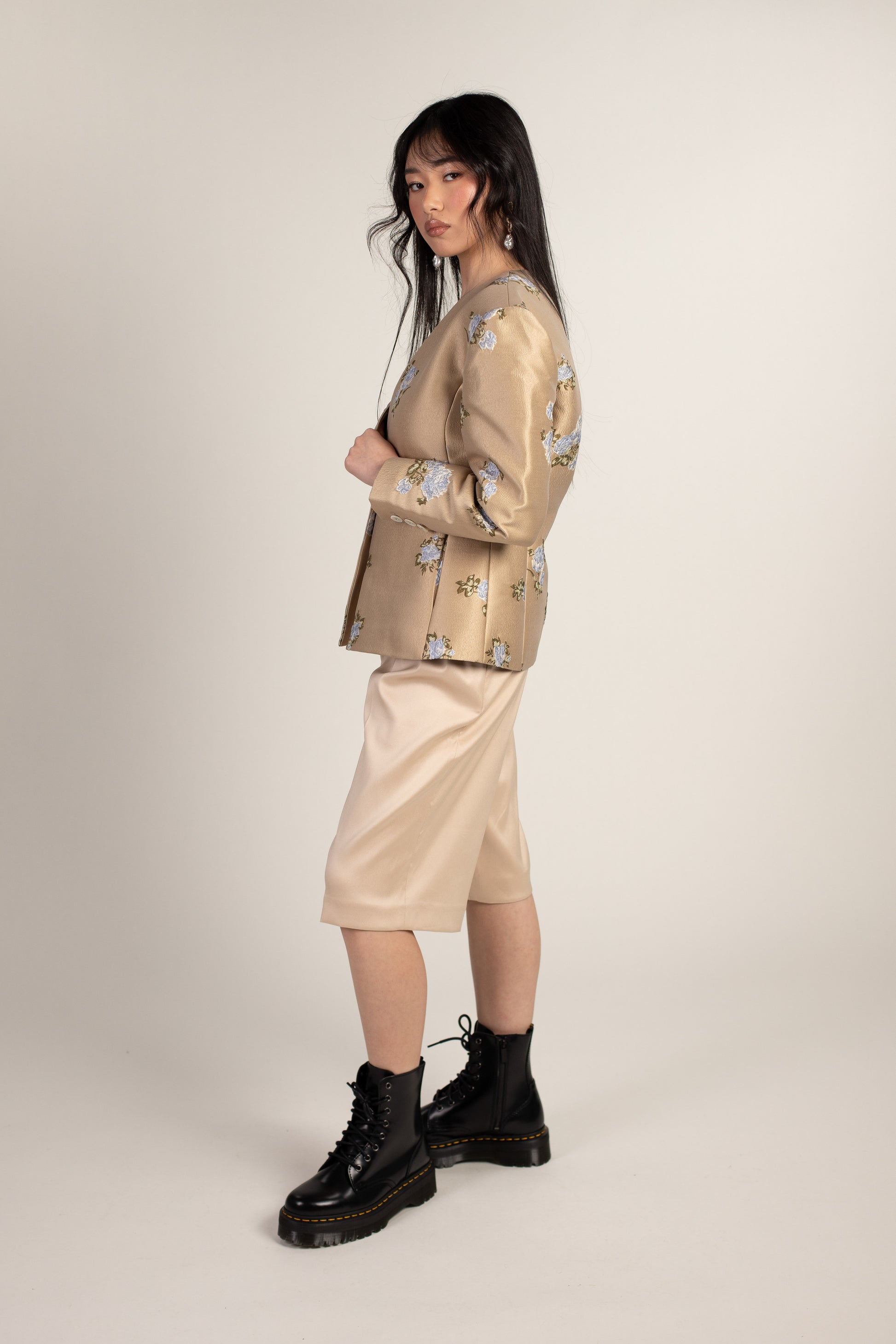 Wykonane z gładkiego materiału (jedwab, elastan), spodenki zapewniają wygodę noszenia i stylowy wygląd. Wysoki stan podkreśla talię, a klasyczny krój sprawia, że spodenki doskonale komponują się z różnymi stylizacjami.