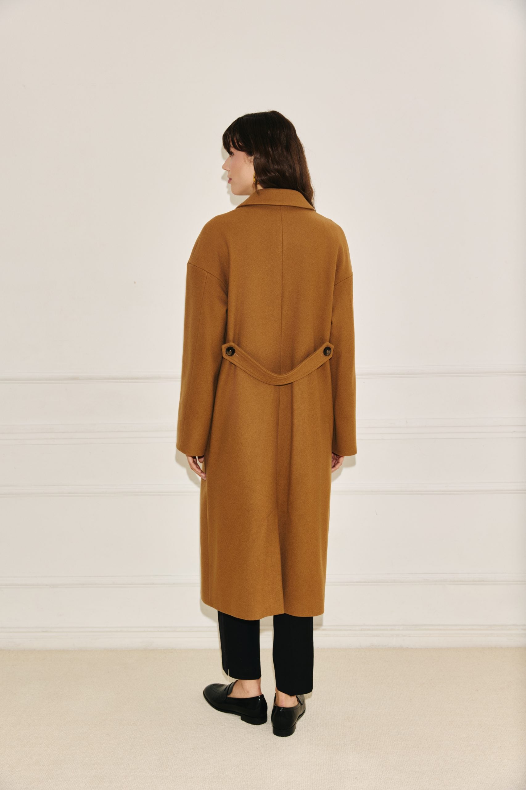 Płaszcz wykonany z miękkiego gładkiego flauszu, mieszanki wełny z kaszmirem w ciepłym karmelowym kolorze. Podszewka w logo marki. Płaszcz występuje w dwóch rozmiarach: 36/38 oraz 40/42, ten fason jest odpowiedni dla kobiet o wzroście powyżej 165 cm.
